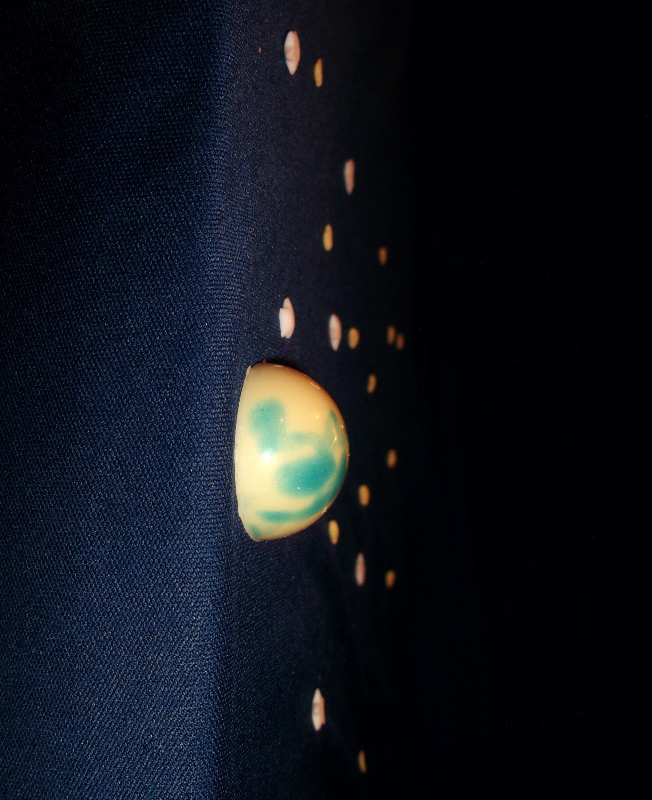 Felolvasztok egy púpozott kiskanál kakaóvajat, és elkeverem benne a lüszterport. A Hold mintájának megfestéséhez igen "trükkösen" tükröztem egy Hold-fotót. A kakaóvaj nagyjából úgy viselkedik, mint a viasz, és épp középmelegen az igazi a festéshez - ha túl meleg, lefolyik, ha túl hideg, akkor pedig már összeragad.